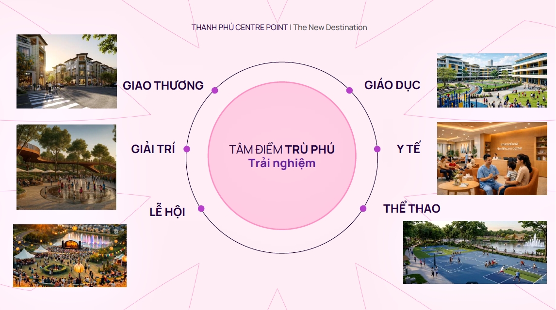 Thanh Phú Centre Point phát triển 4 phân khu: trục thương mại, không gian lễ hội, làng thể thao và làng sinh thái cộng đồng.