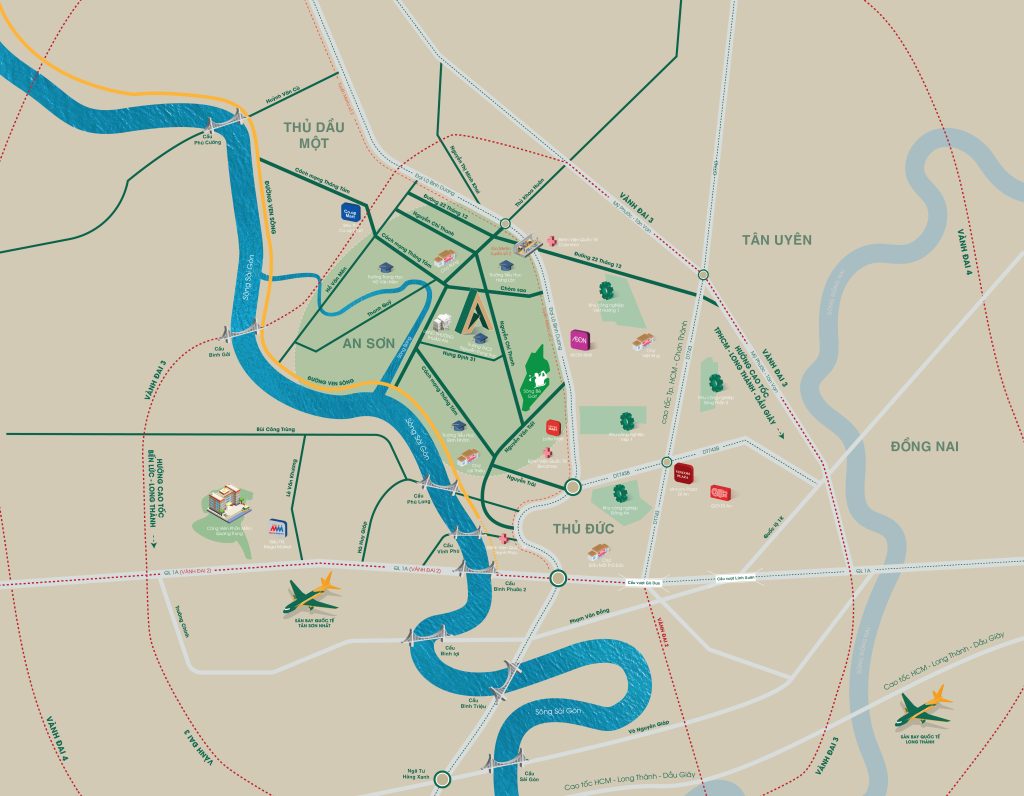 Dự án kết nối nhanh TP.HCM, trung tâm Bình Dương qua các trục lớn như QL13, QL1A và cao tốc Mỹ Phước – Tân Vạn, thuận tiện an cư và gia tăng giá trị đầu tư.